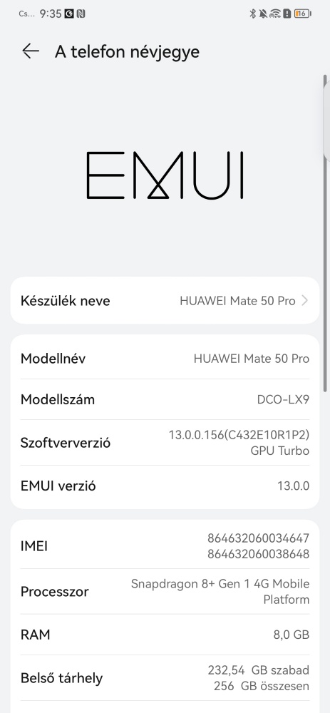 Hardveres fronton a HUAWEI a legújabb megoldásokat igyekezett prezentálni, amelyek elérhetők. A Qualcomm Snapdragon 8+ Gen 1 chipet építette a telefonba, ennek teljesítménye kiválónak nevezhető, hiszen a Mate 50 Pro nagyon gyors, nem akadozik, de ez nagyban köszönhető a HUAWEI szuper optimalizálásának. A 8 GB RAM és a 256 GB háttértár általánosnak mondható a kategóriában. A háttértárat NM memóriakártyával lehet bővíteni, ezekből már nem csak a HUAWEI gyárt kártyát, hanem például a Lexar és a HP is.